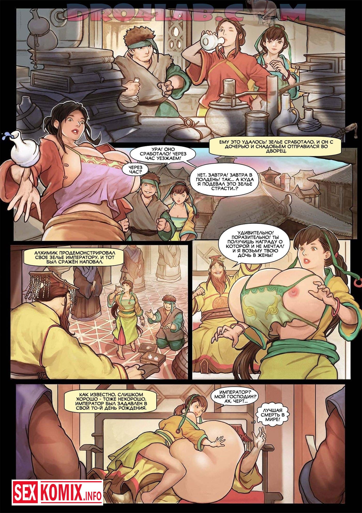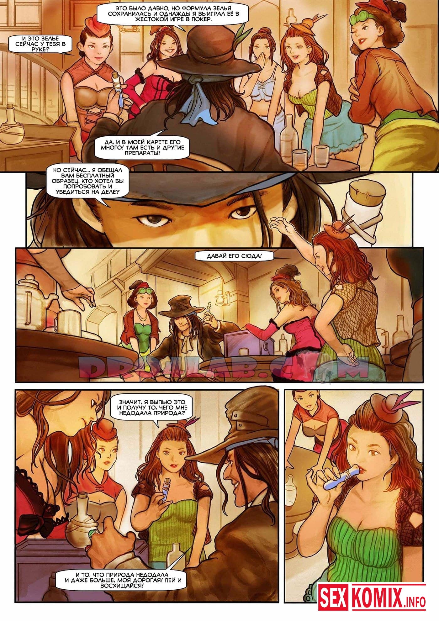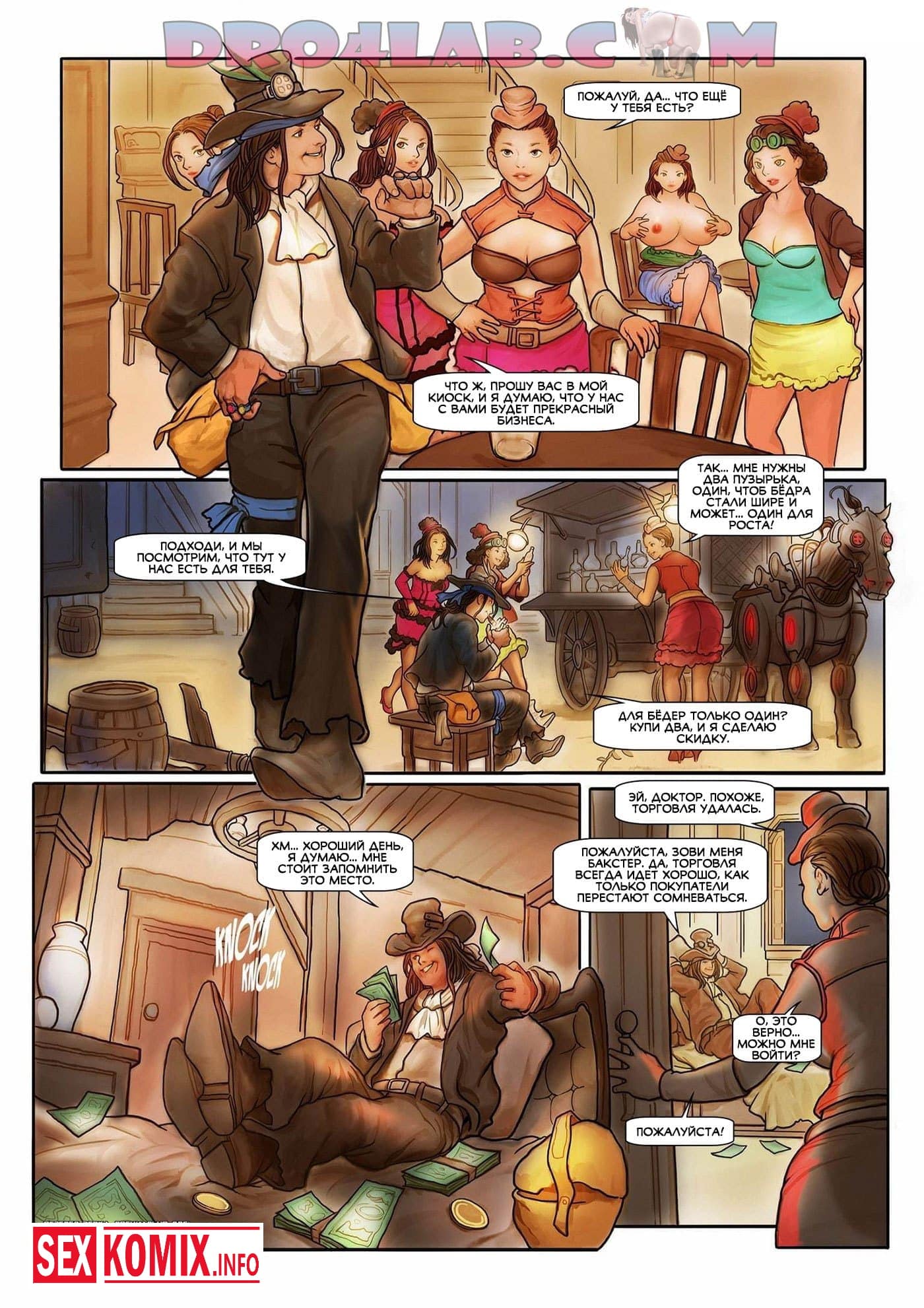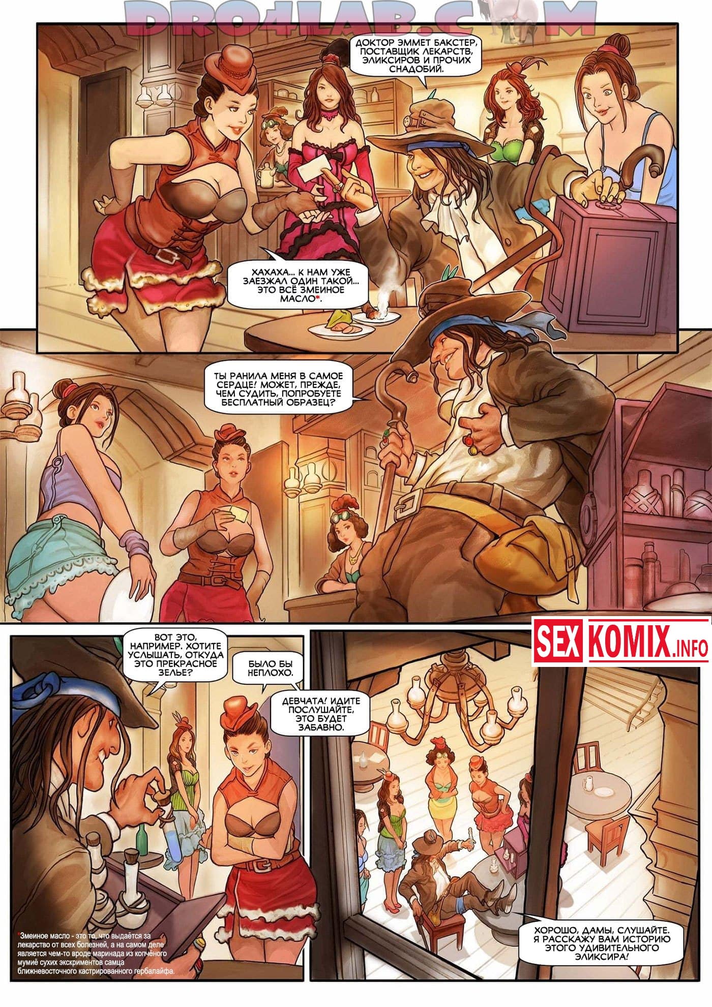 Порно комикс Змеиное масло. Часть 1. Путешественник и змеелов посещает город в старом Техасе, он отправляется в бар, чтобы выпить. На него сразу обращают внимание местные девушки, они приглашают его в отдельную комнату, что бы трахнуть. Змеелов применяет на них своё чудо змеиное масло, от него у красоток вырастают гигантские сиськи и они занимаются горячим сексом.