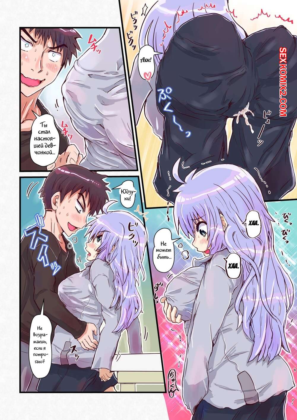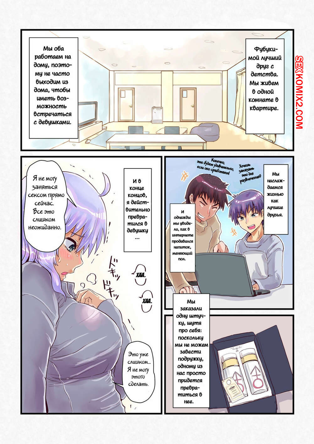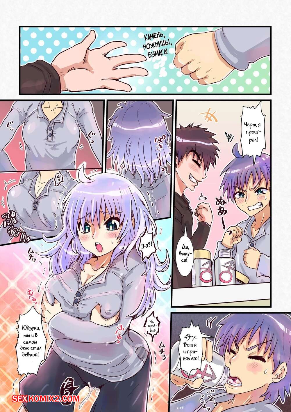 Порно комикс Напиток, меняющий пол. Nyotaika Shitara Osananajimi Парень угостил своего друга напитком, после чего он превратился в девушку. Парень решил этим воспользоваться и раздел свою новую подругу, после чего хорошенько ее выебал.